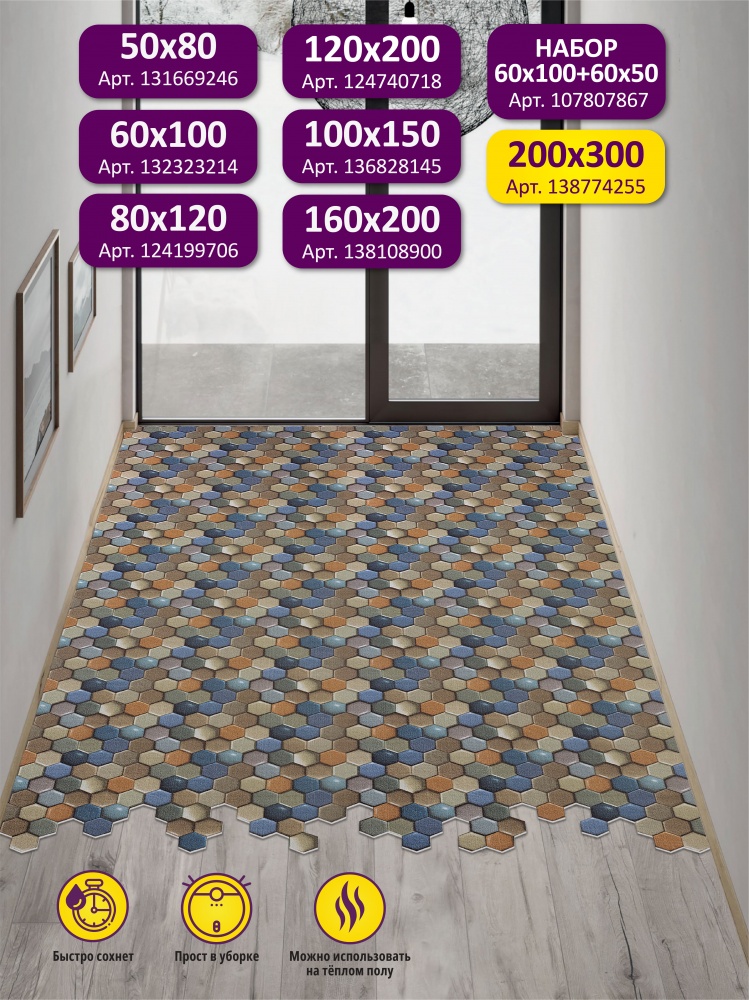 Icarpet PRINT - вырезной антискользящий коврик, отличное решение для любого жилого пространства. Благодаря уникальному современному дизайну коврик идеально впишется в гостиную, спальню, ванную комнату, кухню, коридор. Основа с точечным нанесением ПВХ не скользит на любой поверхности, можно стелить на тёплый пол. Коврик хорошо впитывает влагу и быстро сохнет. Он прост в уходе: достаточно постирать в стиральной машине и он как новенький!